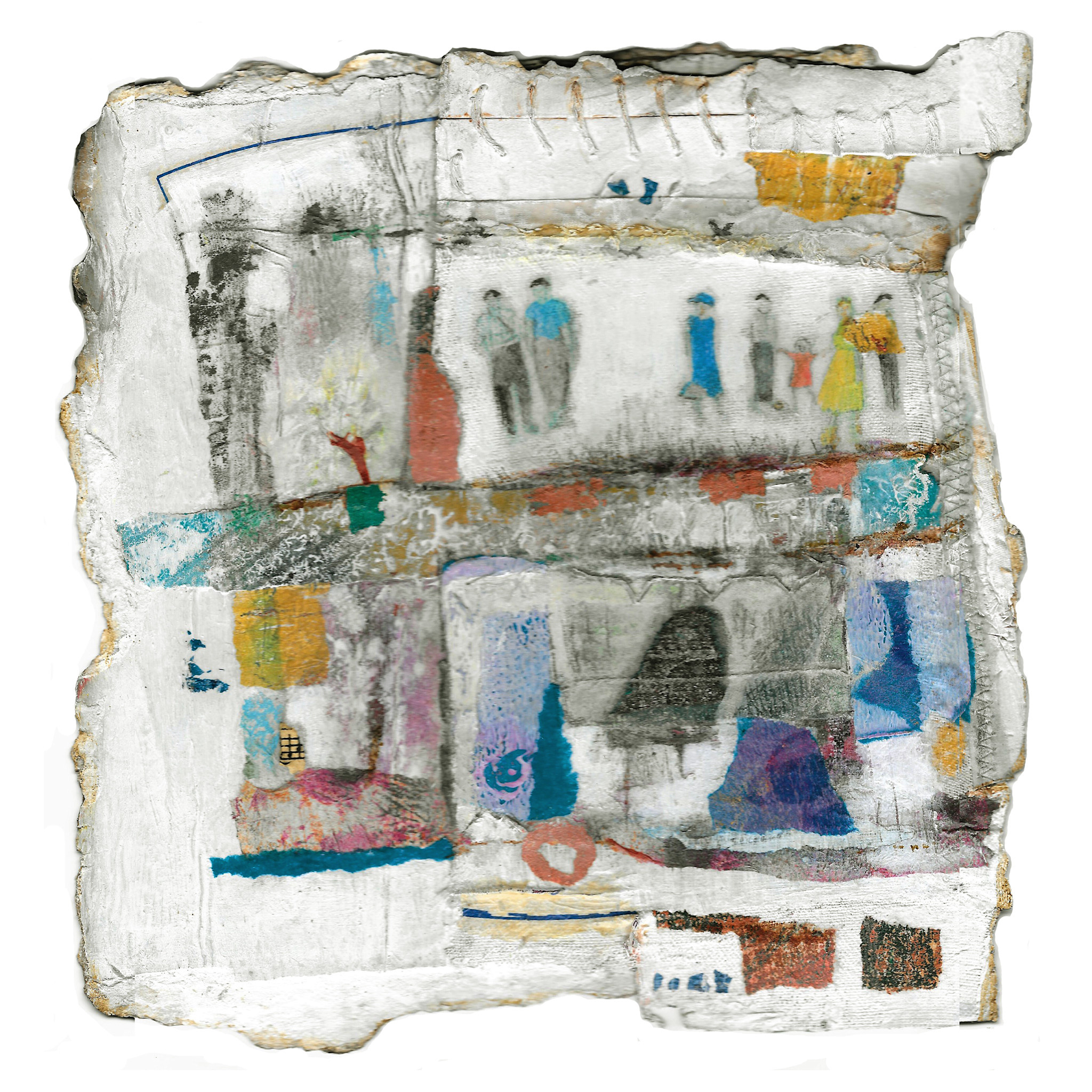 Ein letzter Ausflug. Malerei und Collage. Bemalte Papiere auf Raupapier. Acryl, Gouache, Tinte, Pastell, Wachs, Faden. Maße gerahmt: B 36,5 cm x H 36,5 cm x T 2 cm. Bild: B 121 cm x B 122 cm.