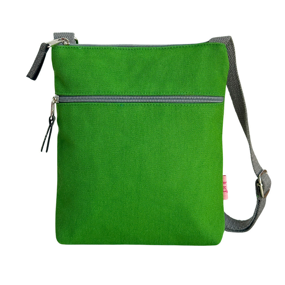 Grasgrüne Umhängetasche aus Baumwoll-Canvas | verstellbarer Riemen | Reißverschlusstasche | bedrucktes Baumwollfutter | Maße: B 18 cm x H 21 cm