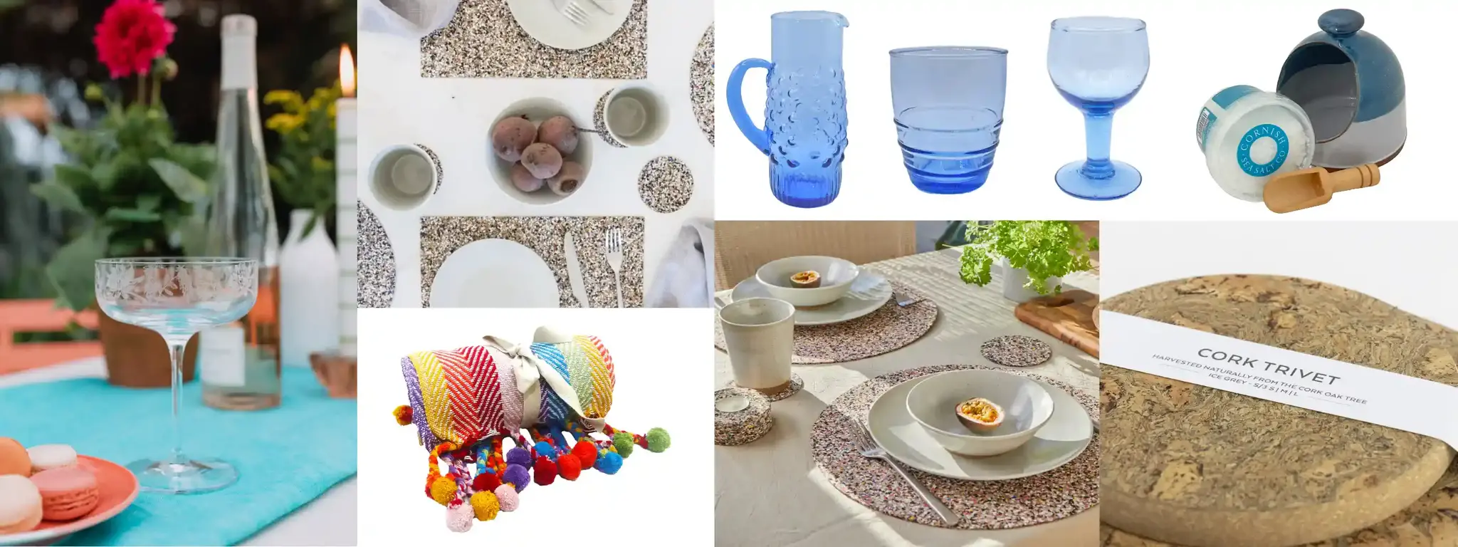 Transform your picnic or garden table with cleverly repurposed textiles. OS map tea towels by Jane Revitt make whimsical tablecloths, and colourful striped throws by Shared Earth double as both picnic blankets and wraps. Liga’s recycled cork and oak mats, coasters, and trivets protect surfaces while adding organic texture to your setting. Glassware by Emma Britton, delicately etched and beautifully designed, elevates every sip, while Shared Earth’s recycled tumblers and goblets in soft blues bring a relaxed charm.