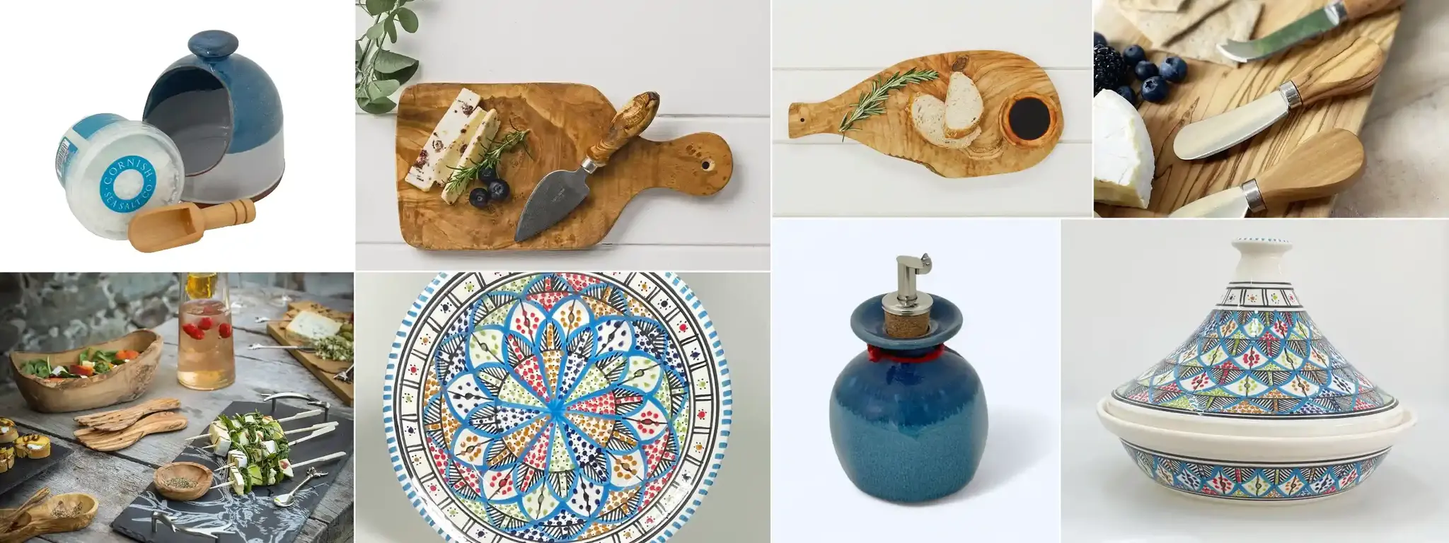 Turn your table into a talking point with hand-thrown ceramic olive oil decanters and garlic pots by RB Ceramics, evoking shades of sea and sand. For rustic charm, Selbrae’s olive wood cooking utensils and platters bring earthy elegance, and the generously sized ladles are perfect for generous servings. Show off your local pride with a unique apron featuring the OS map of Todmorden by Jane Revitt—a gift any head chef would love. For a splash of Mediterranean colour, the vibrant, handmade ceramic serveware from New Overseas Traders includes shaped serving bowls, dipping dishes, and stunning tagines. Keep drinks cool (and stylish) with hammered copper flasks and mugs from Shared Earth, perfect for hydration with a healthy, natural twist.