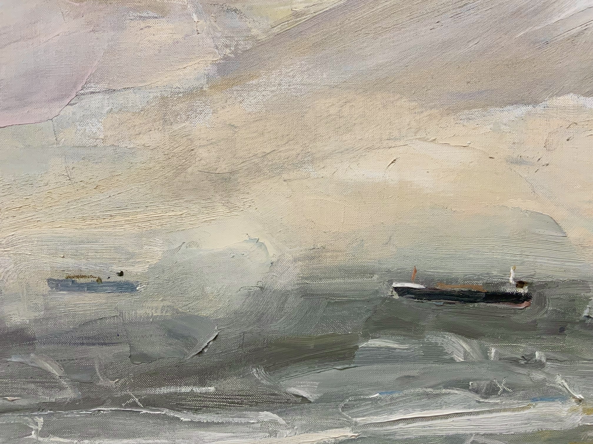 It is this relationship and this environment that has inspired Shields’s most recent solo exhibition ‘From Shore to Sea: Storms, Breezes, and Hazes.’ In contrast with the usual public perception of coastal towns as leisurely seaside resorts, Shields’s views of the at once turbulent and tranquil sea serve as a counterpart to this, depicting deep sea shipping, global trade, and large crafts on the horizon battling with the elements in a further exploration of the energised clash between the old and new. Abigail Braim 2021