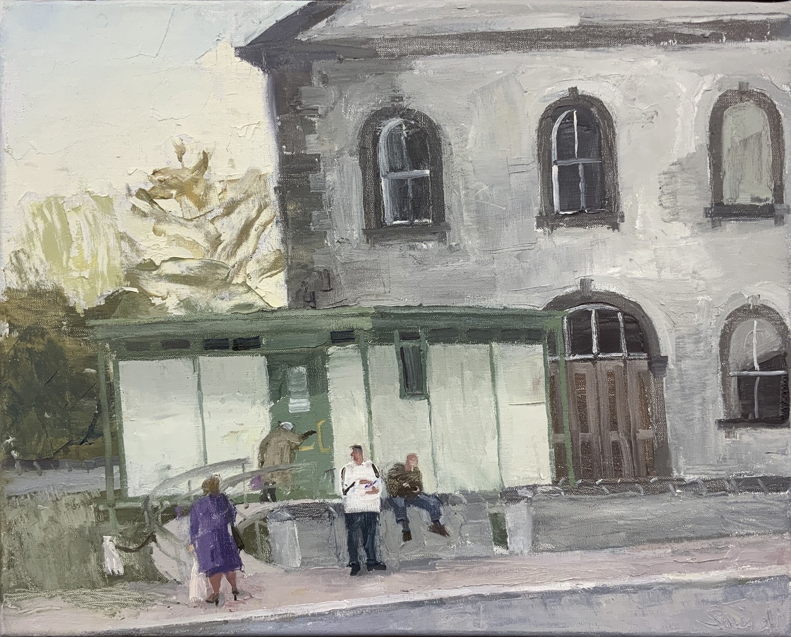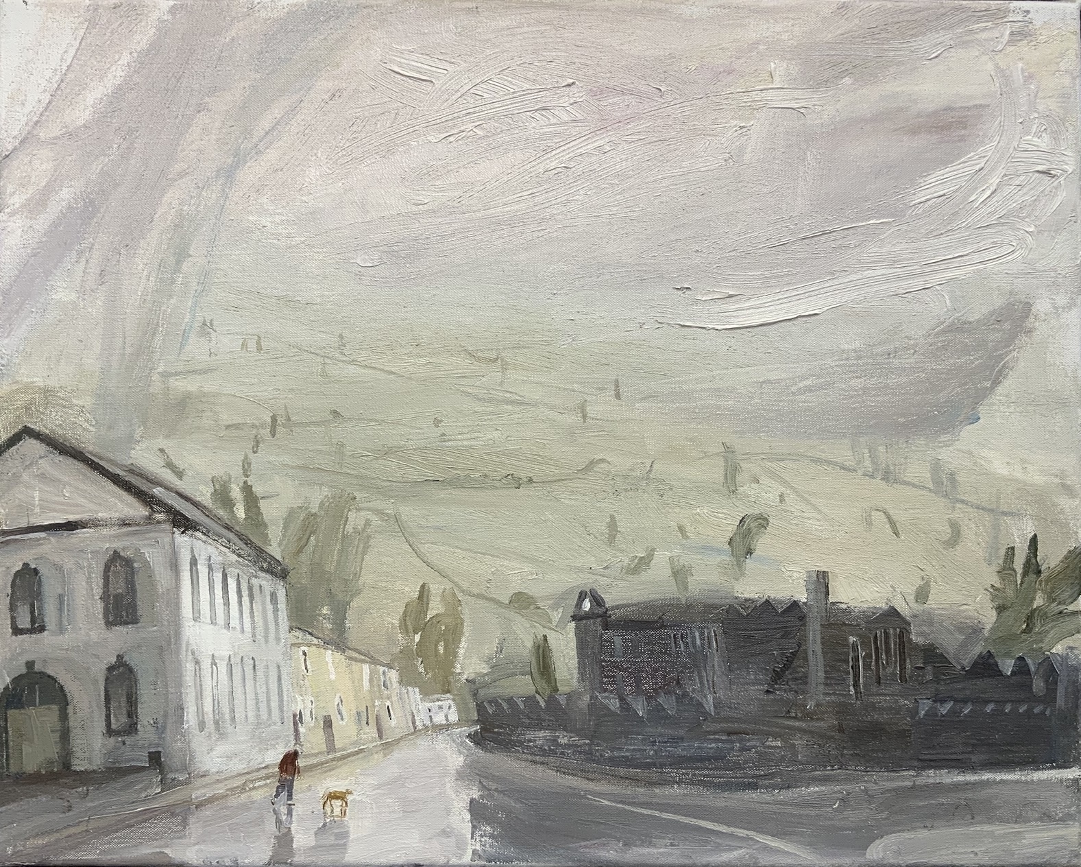 Margaret Shield’s visit and stay in Todmorden in the spring of 2016, was blessed with typical April showers, rather downpours. How she managed to conjure up 5 or 6 masterful oil paintings is amazing. While much needed tea and cake, shelter and sympathy was given in abundance back in the gallery, we quizzed Margaret’s partner, who divulged that his main task, apart from chauffeur and PR, was to hold a huge golfing umbrella to protect artwork and artist alike from the worst of the deluge that Calderdale could offer. The gathering of sketches and notes were later developed into the fine oils you can see as an offshoot to her current solo exhibition’