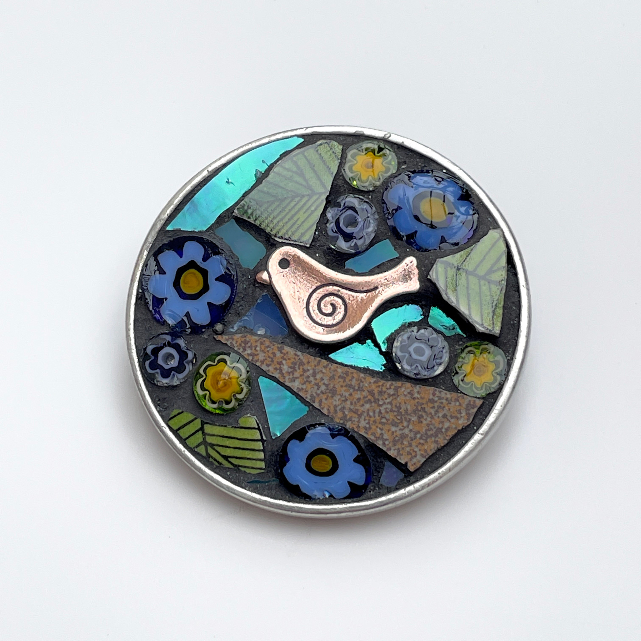 Angela Ibbs Bird and Blue Flowers Round Mosaic Brooch 53