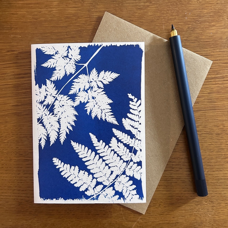 The cyanotype process is a camera-less photographic technique creating a Prussian blue image by exposing a light-sensitive coated paer to UV light (sunshine). These beautiful cards are giclee prints from original works.