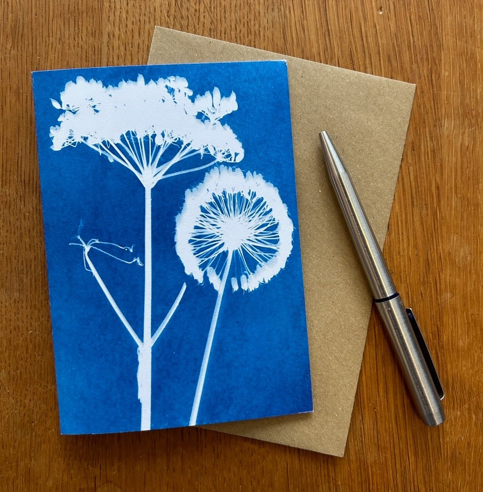 The cyanotype process is a camera-less photographic technique creating a Prussian blue image by exposing a light-sensitive coated paer to UV light (sunshine). These beautiful cards are giclee prints from original works.