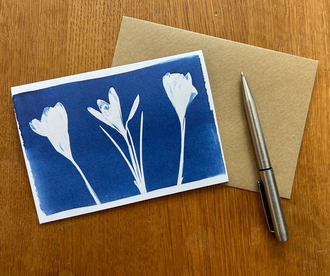 The cyanotype process is a camera-less photographic technique creating a Prussian blue image by exposing a light-sensitive coated paer to UV light (sunshine). These beautiful cards are giclee prints from original works.
