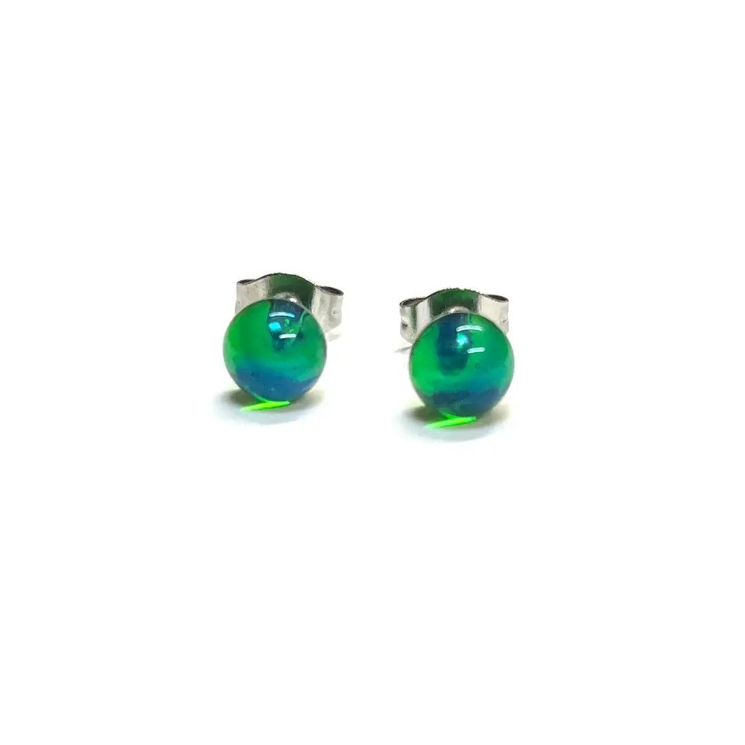 This listing is for a lovely little pair of handmade glass stud earrings in transparent electric blue. / green.