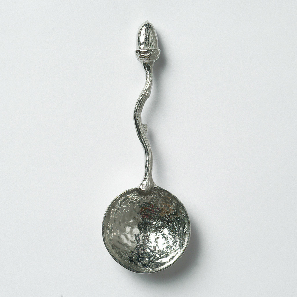 A delicate acorn sits on top of a twig stem handle in this delightful little pewter spoon.