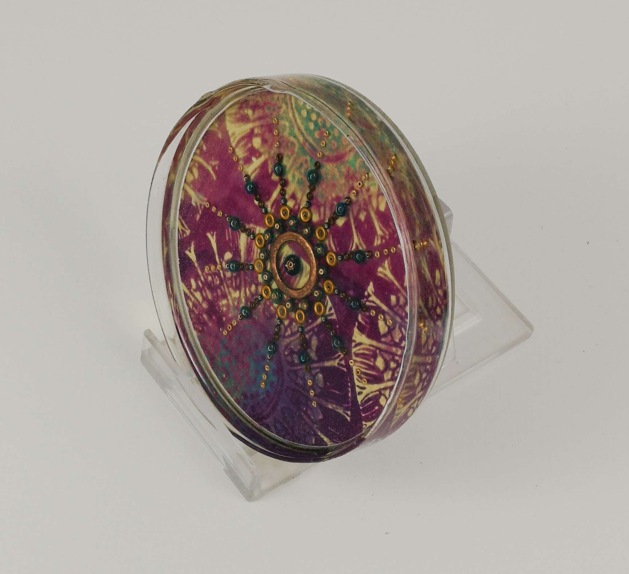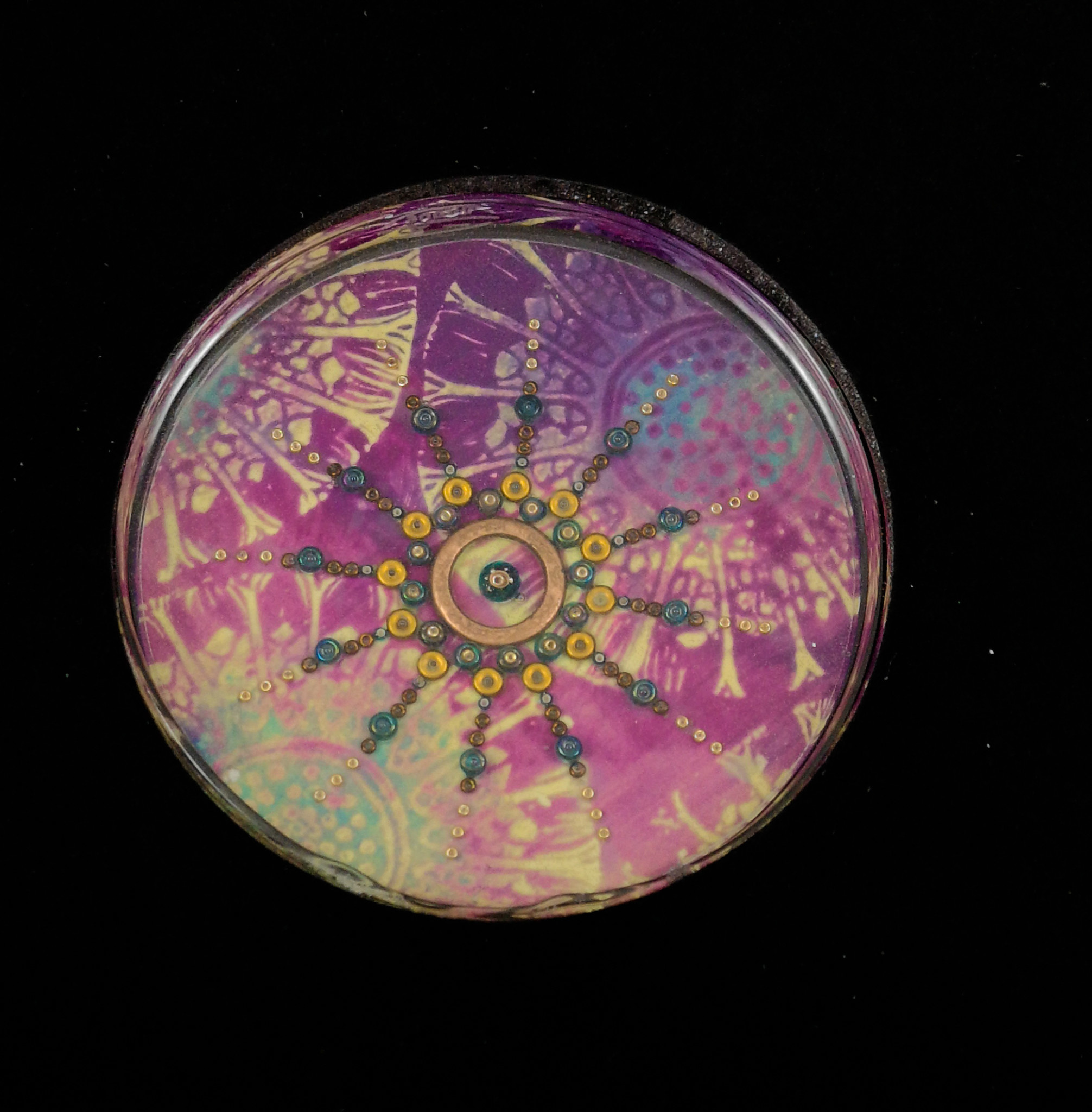 This glass petri dishes are influenced by Nimanoma’s background in biology. The petri dish comes beautifully boxed and with a stand. All her work carries through it colour and detail, often from a microscopic perspective.The forms and intricate details found in nature are always inspirational and are illustrated in her artwork and photography. She manipulates images of larger artwork and embedding it in a dome of resin, and embellishing with colourful tiny