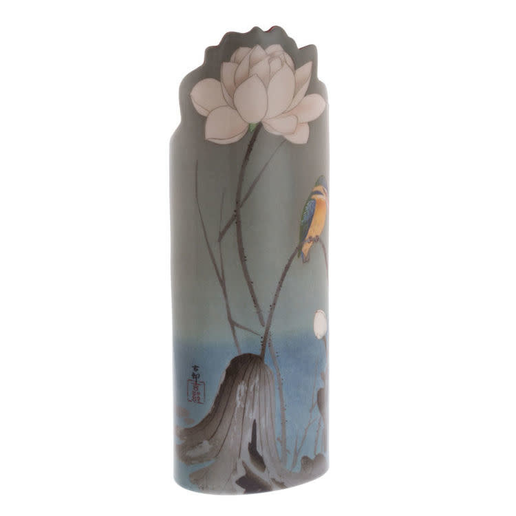 Kingfisher with Lotus Flower is a 20th Century woodblock print by Japanese artist Ohara Koson. The ceramic vase on which it is depicted has been shaped to follow the outline of the artwork creating a stylish contemporary piece.