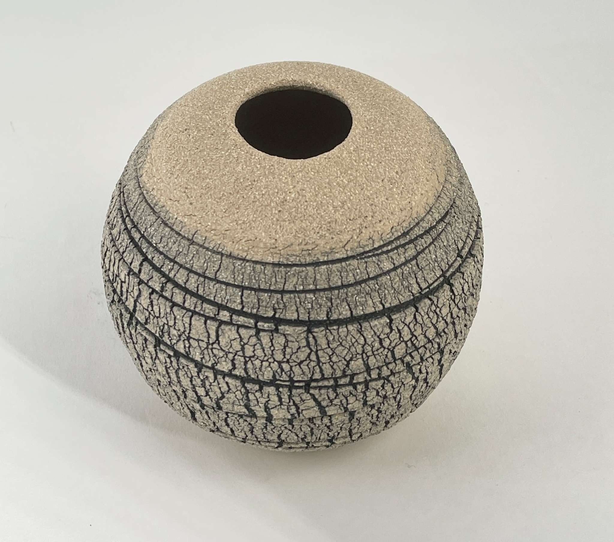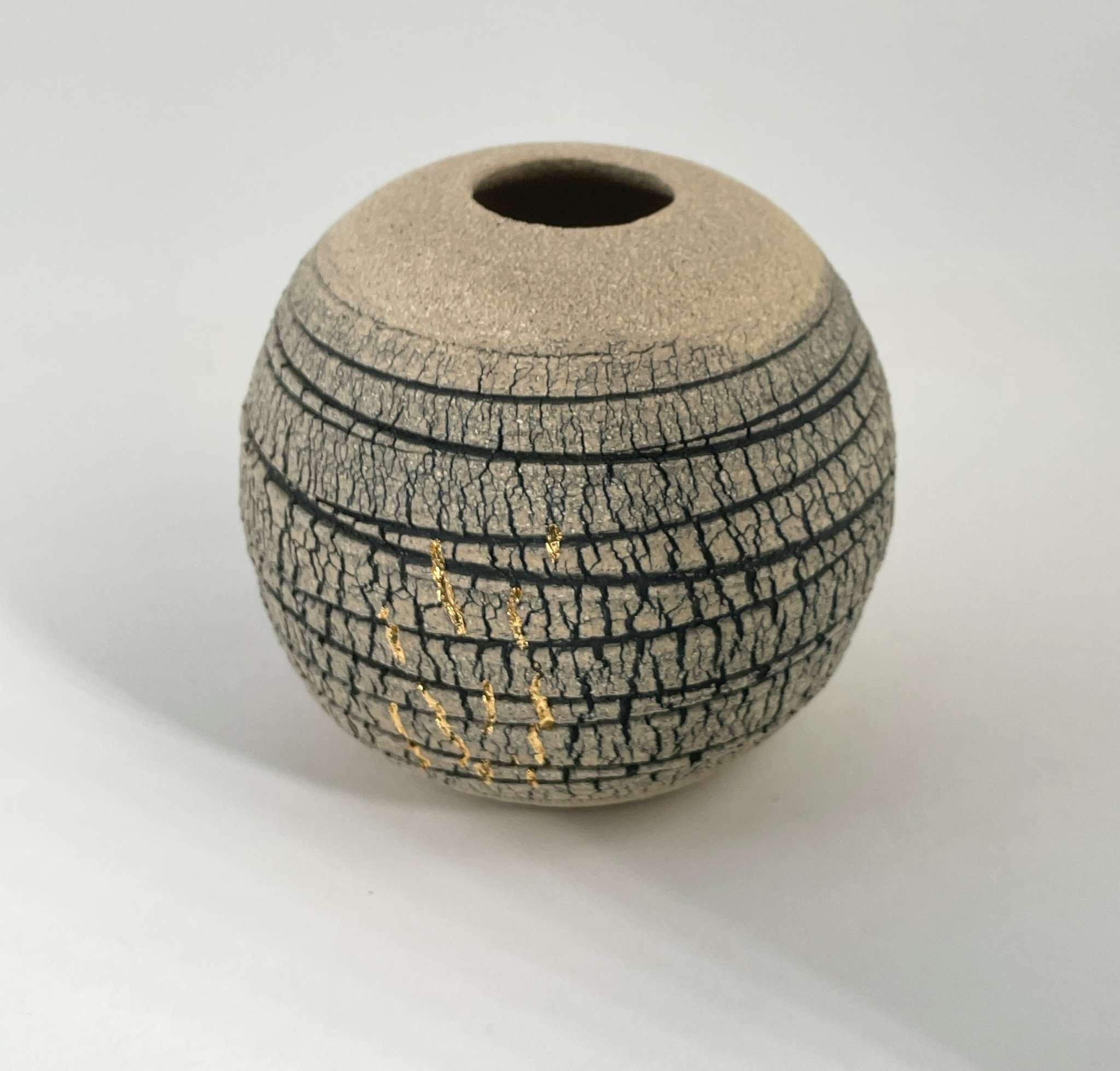 Her love of the natural environment greatly influences her work, with the inspiration of limestone pavements and tree bark reflected in the surface patterns of her ceramics. She uses a finely grogged clay which gives a wonderful feel to the finished pieces and compliments the cracked surfaces created on the outside. Her recent work includes moorland colours with deep fissures and some with platinum lustre to add sparkle, reminiscent of the geological seams and underwater springs beneath our feet.