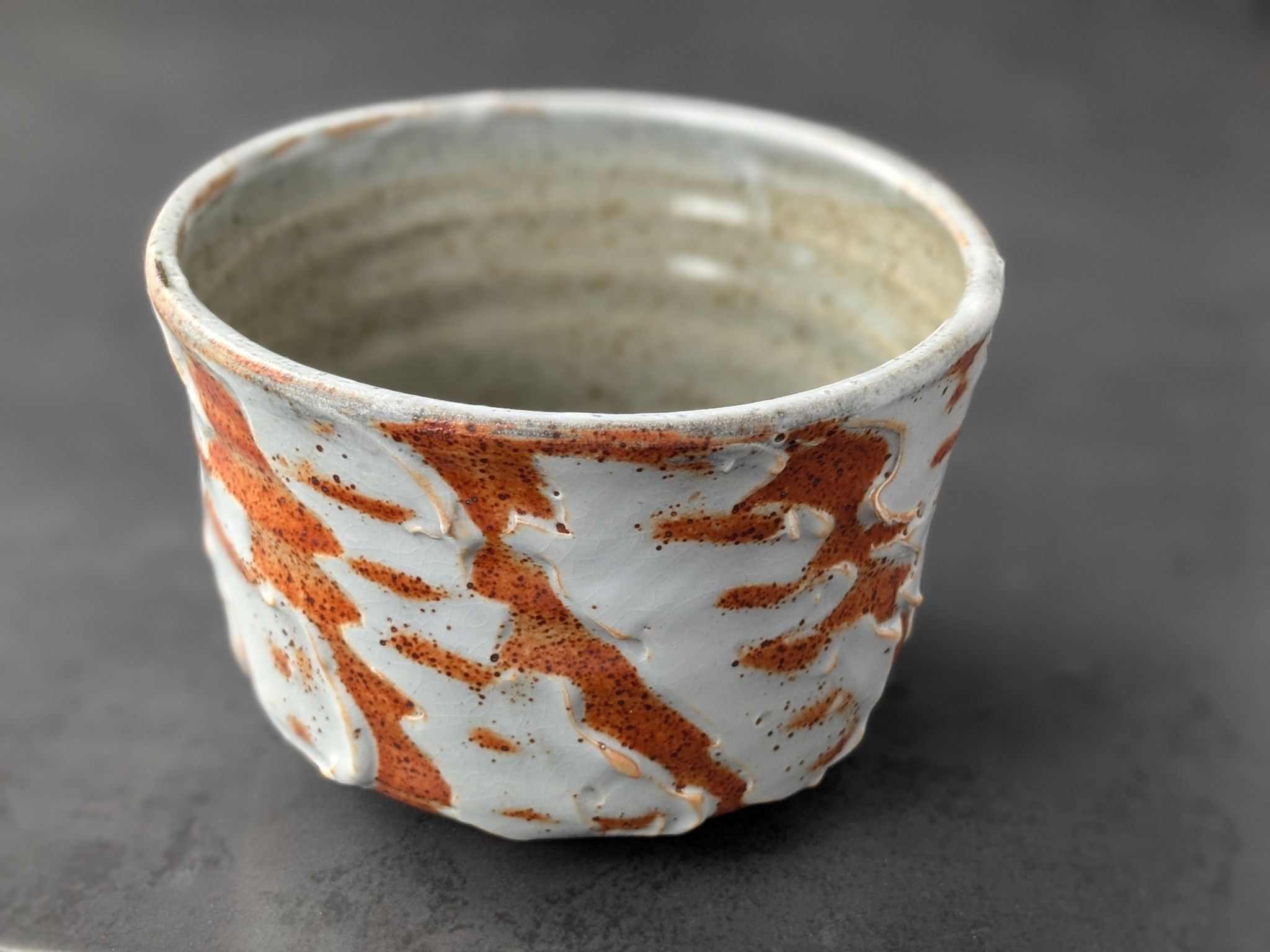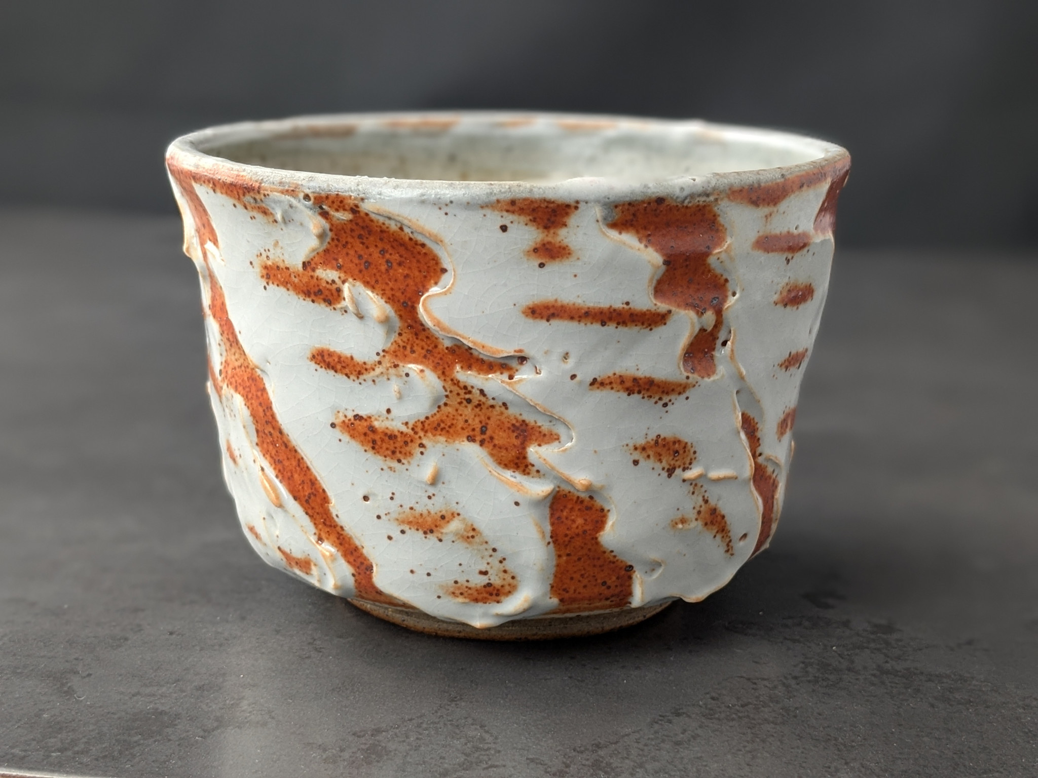 Shino glazed Chawan tea bowl. Reduction fired stoneware with thick porcelain slip, speckled clear liner glaze.