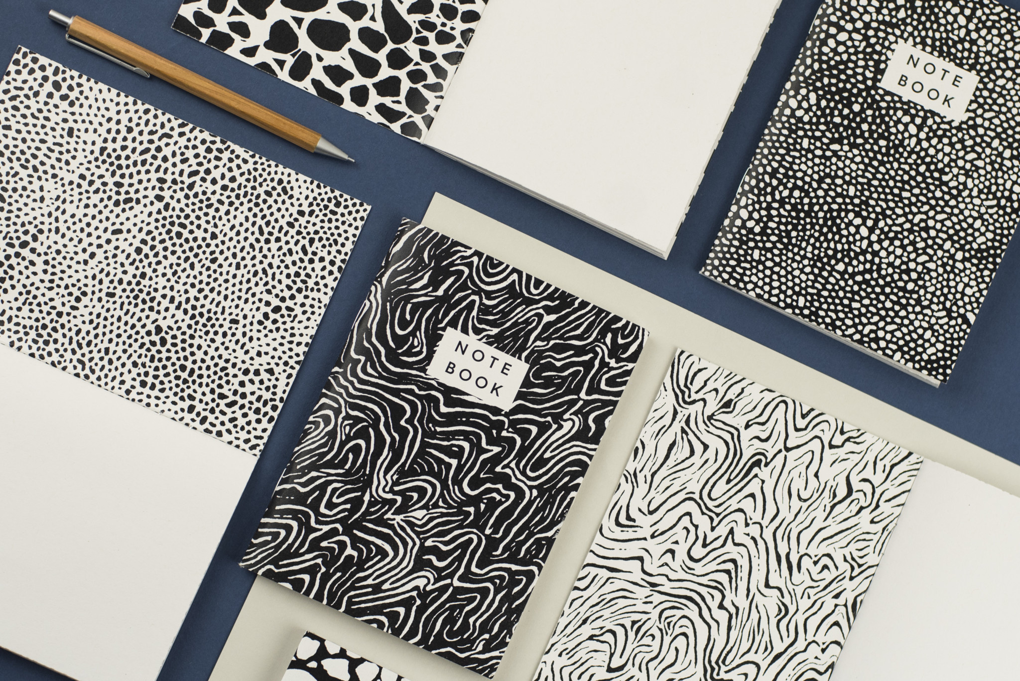 Useful and well designed plain paged notebooks in a set of 2 made with 100% recycled paper. Set features a 'spore' pattern developed from original lino prints and patterns on natural white covers.
