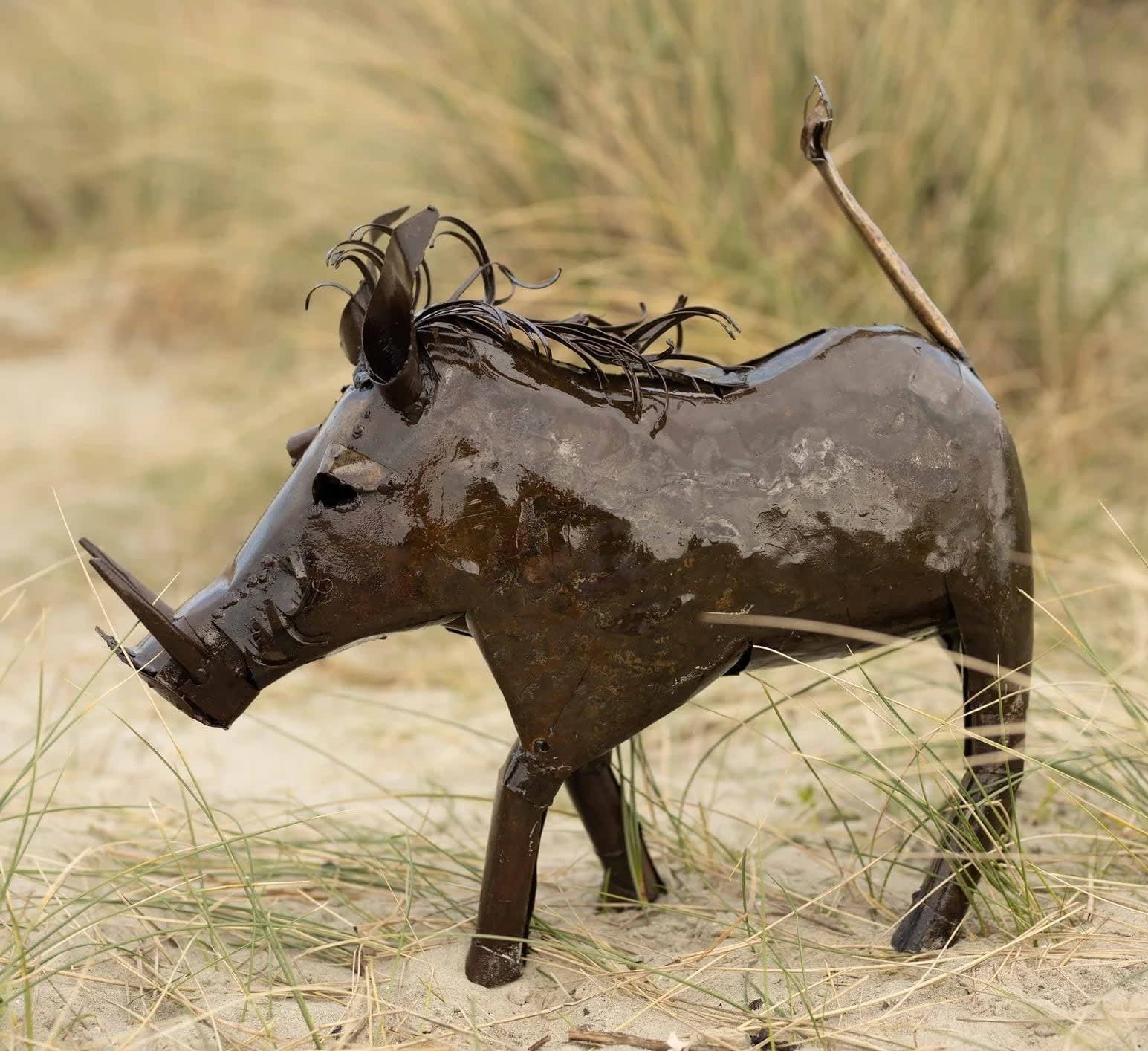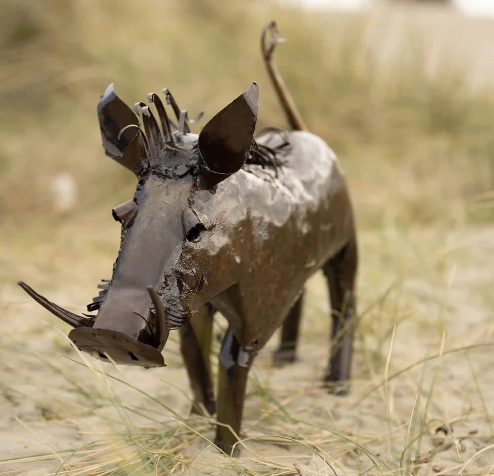 Crafted from a mix of recycled metals, this warthog sculpture captures a stunning sense of movement, bringing to mind the image of a wild hog charging through tall grasses. Its dynamic design adds energy and character to your garden. For an even more striking display, pair it with the smaller warthog to create a captivating wild scene in your outdoor space.