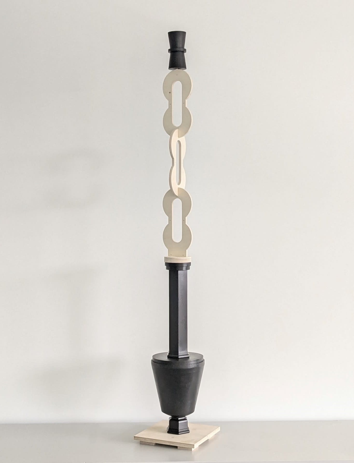 Une sculpture au sol, créée à partir de bois recyclé et récupéré qui a été assemblé dans un processus additif pour construire une forme verticale simple et organique, qui prend en compte la distinction entre la sculpture et l'architecture.