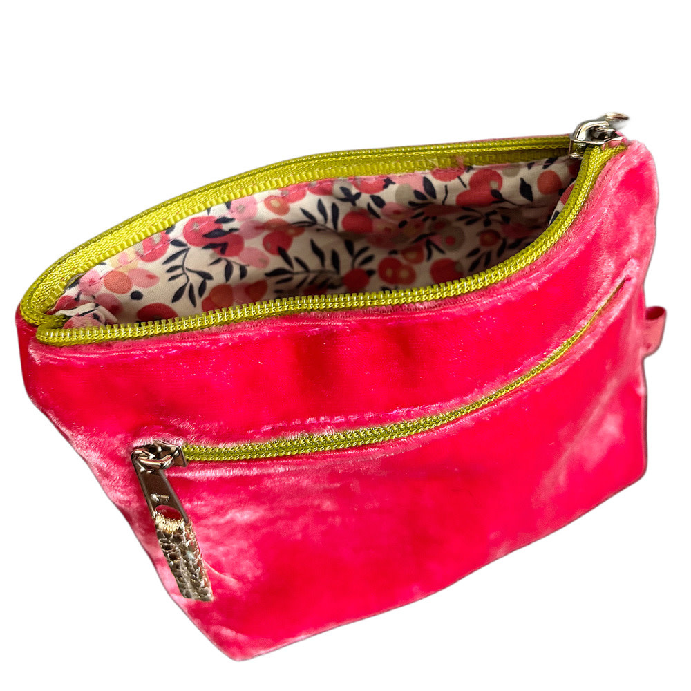 Pochette en velours rose flamant à deux fermetures éclair, doublure en coton, fermeture éclair contrastée, étiquette. Dimensions : L 14 cm x H 10 cm. Poids : 25 g.