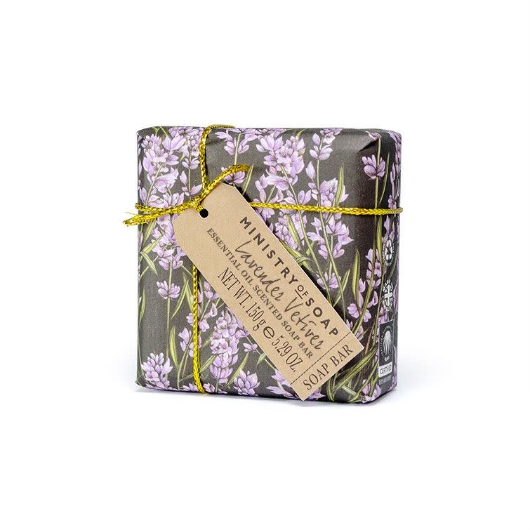 Cette barre de savon à triple broyage de couleur naturelle est mélangée à de l'huile essentielle de lavande et de vétiver. Le design opulent combine des couleurs vives avec des fleurs de lavande. Emballage cadeau et fil d'or