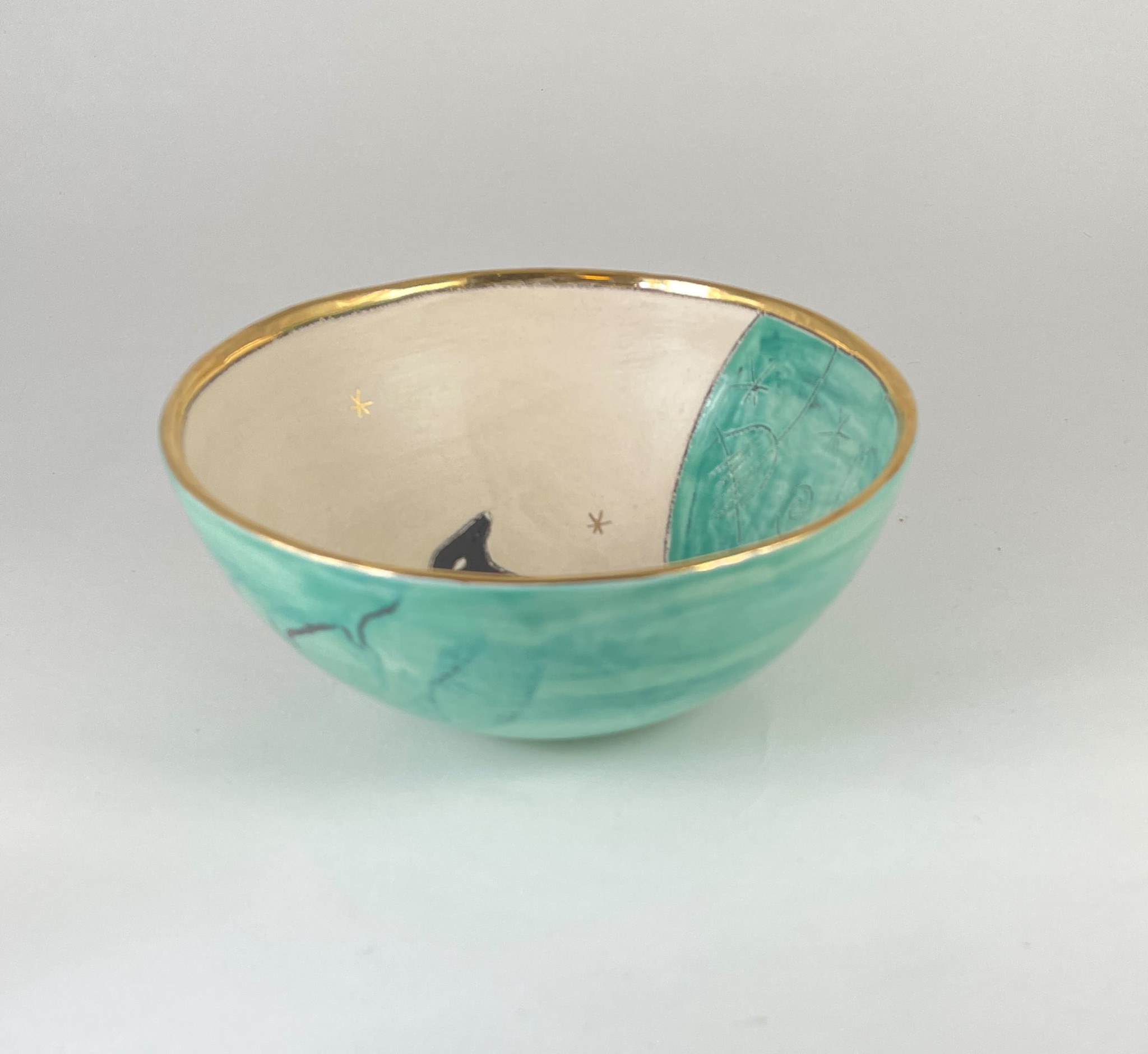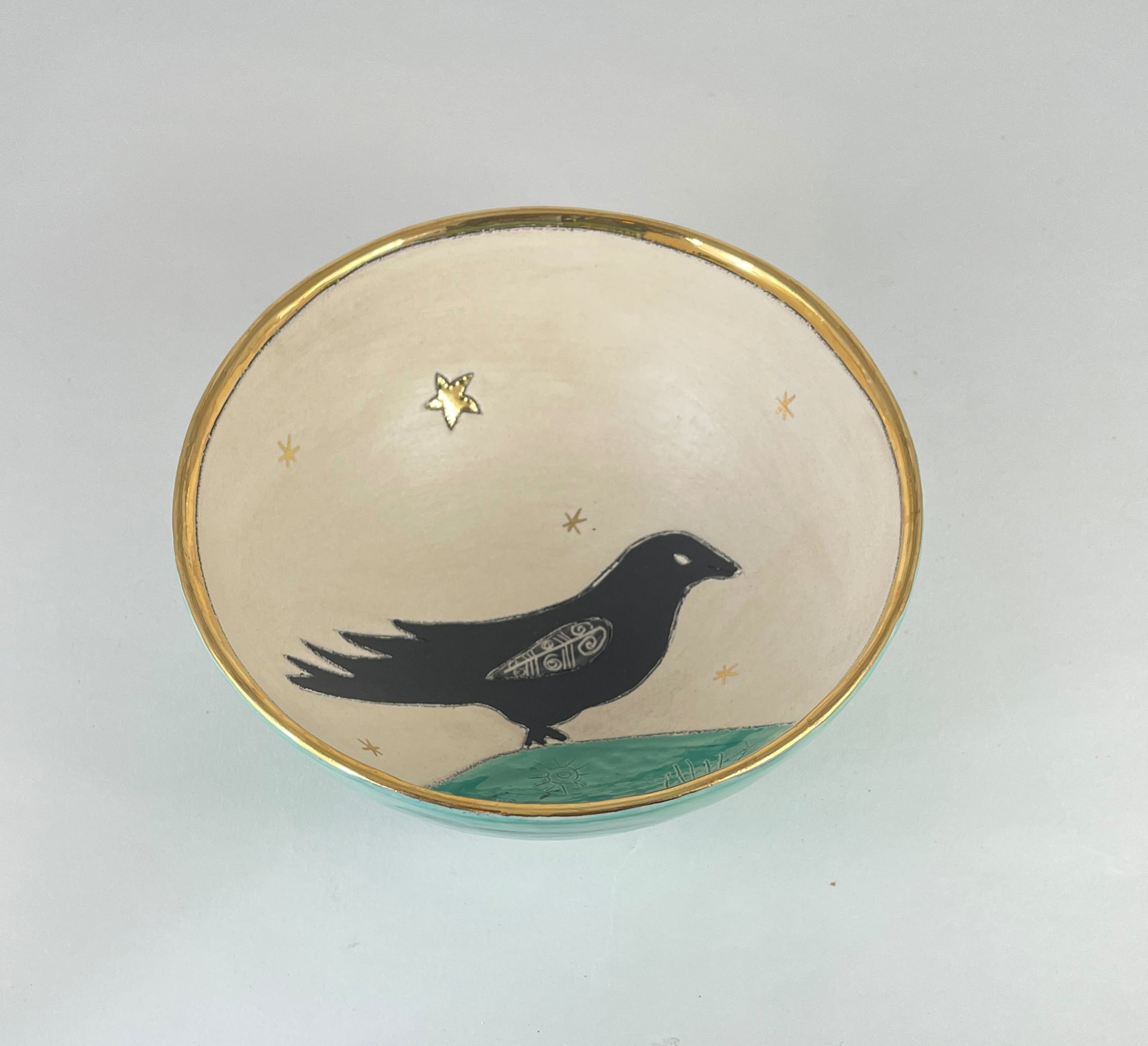 Керамическая миска с изображением ворона на синем холме и золотыми звездами