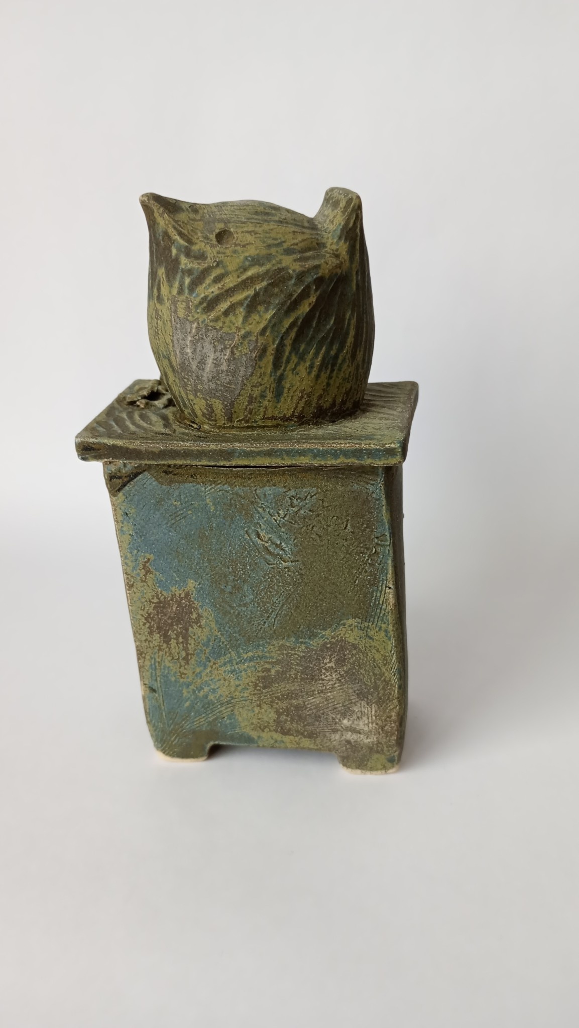 Моя работа состоит из ручного изготовления плит, рулонов и моделирования, чтобы получить нужные мне формы. Поверхности изменяются путем соскабливания, резьбы, наконец, я использую сухую зелено-синюю глазурь, чтобы подчеркнуть следы. Обожжен до низкой керамики.