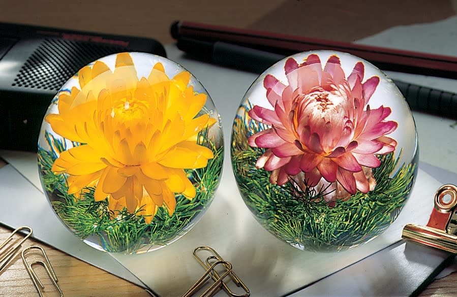 Прозрачная полиэфирная смола, содержащая УФ-фильтр, предотвращающий выцветание, используется для заливки ботанических образцов, не разрушая их, как это было бы с расплавленным стеклом, а шарообразная форма позволяет рассматривать образец во всей его красе со всех сторон, создавая эффект кристальной прозрачности.