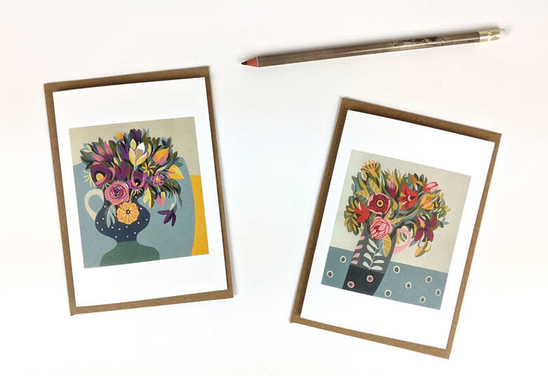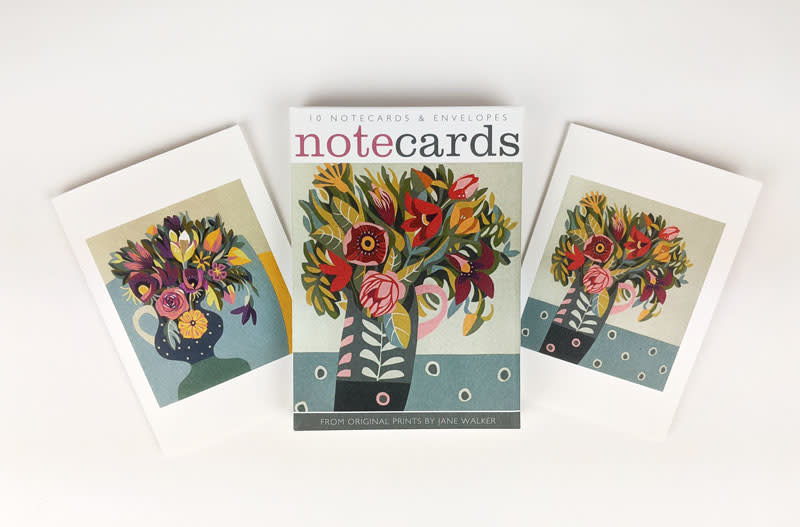 Kanna med rosa handtag och lila och rosa anteckningskort av Jane Walker