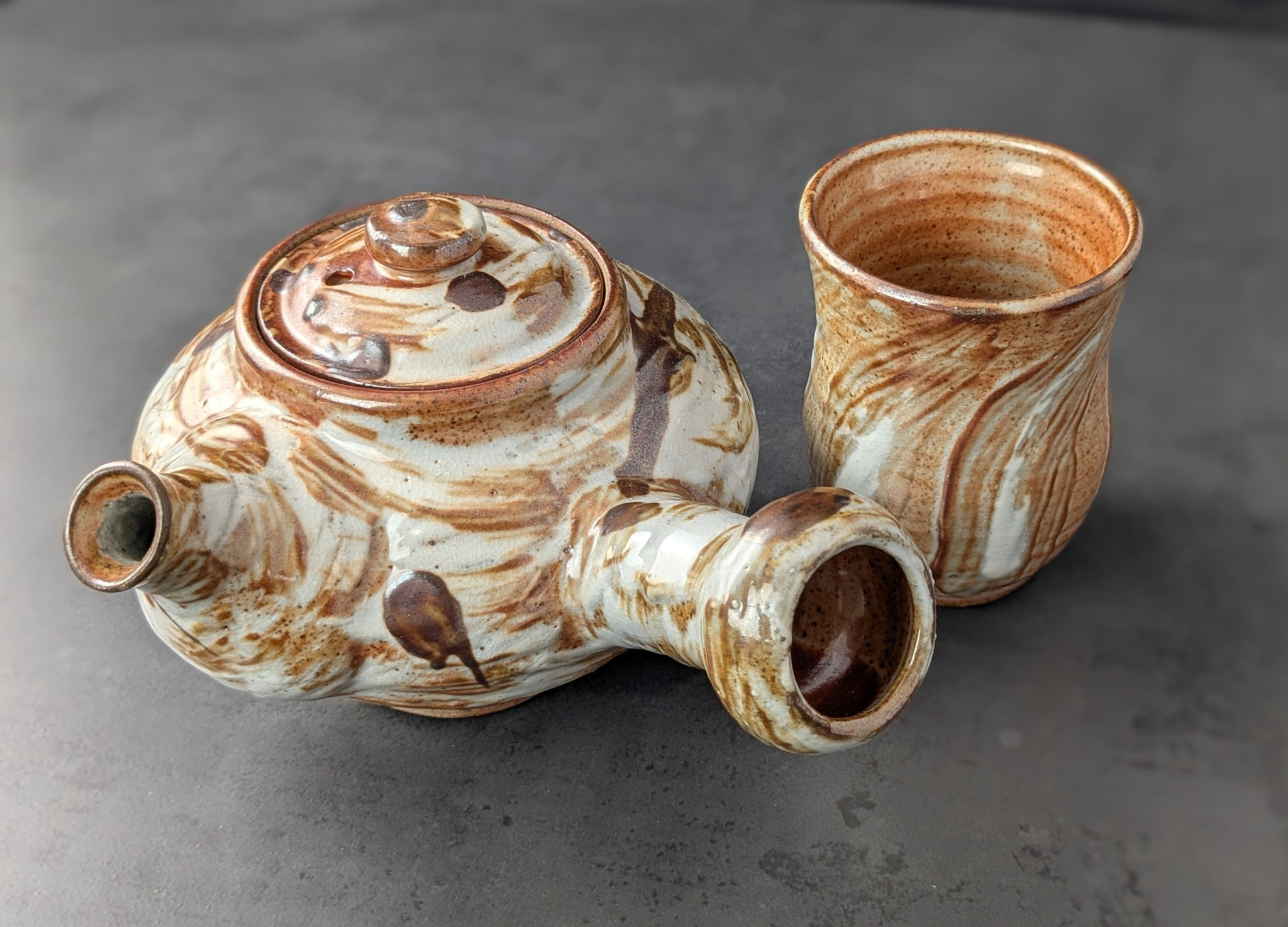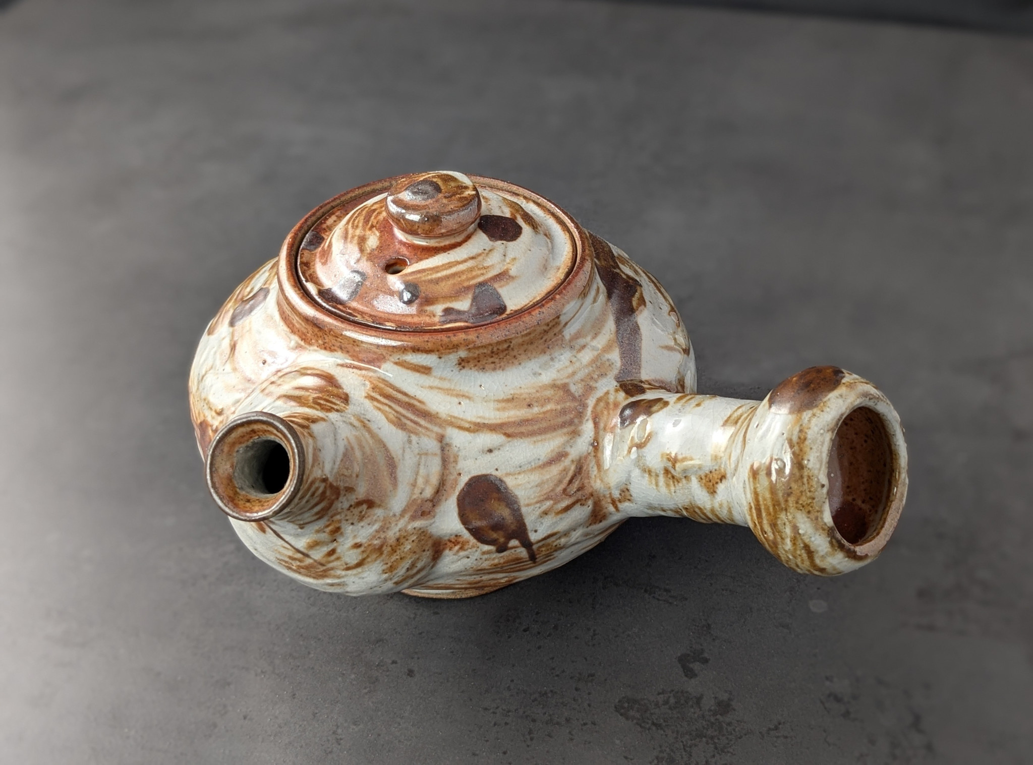 Shino-glaserad Kyusu-tekanna med sidohandtag. Vedeldad stengods med borstade belägg av vildlera, terakotta och porslin.
