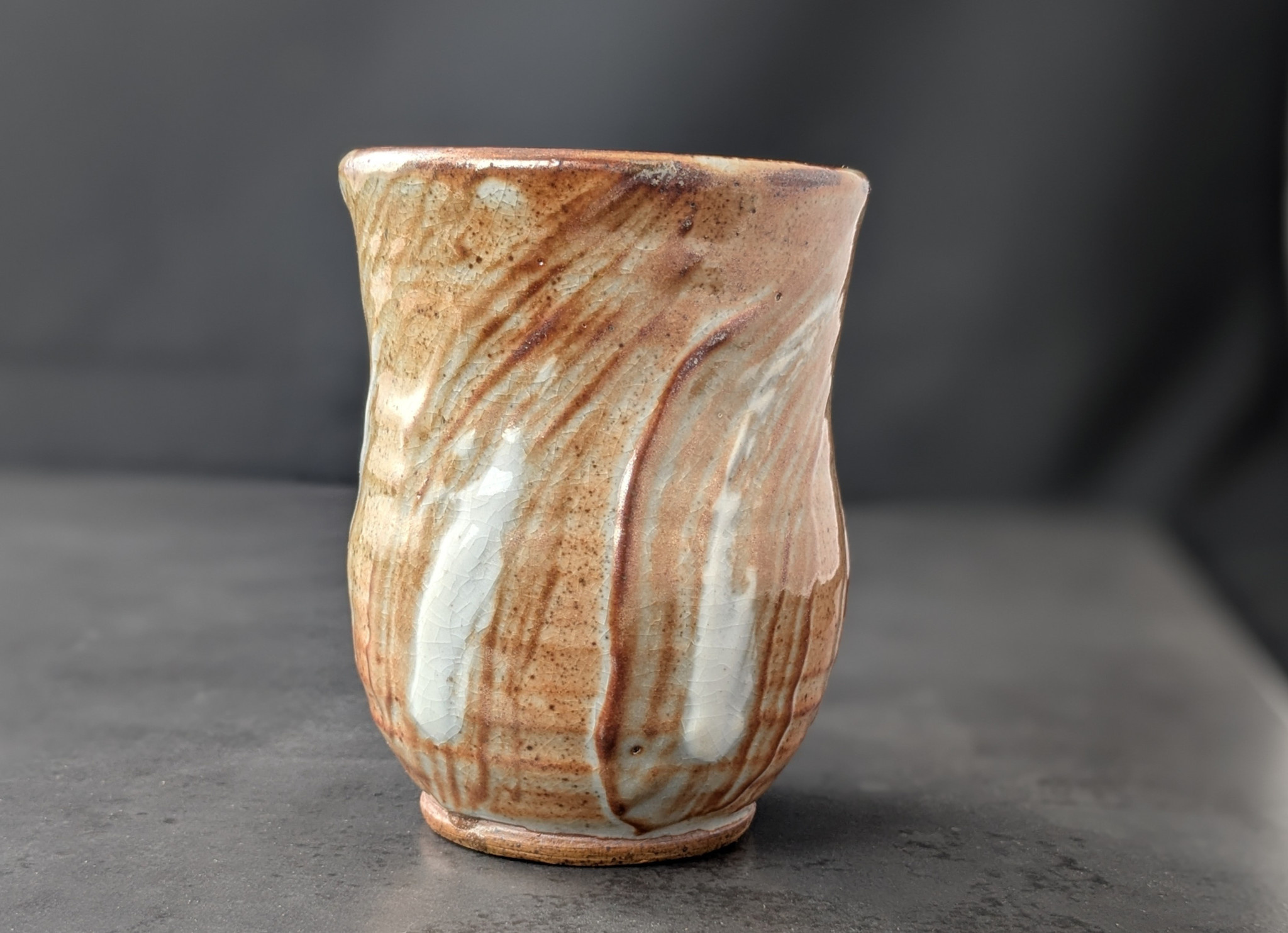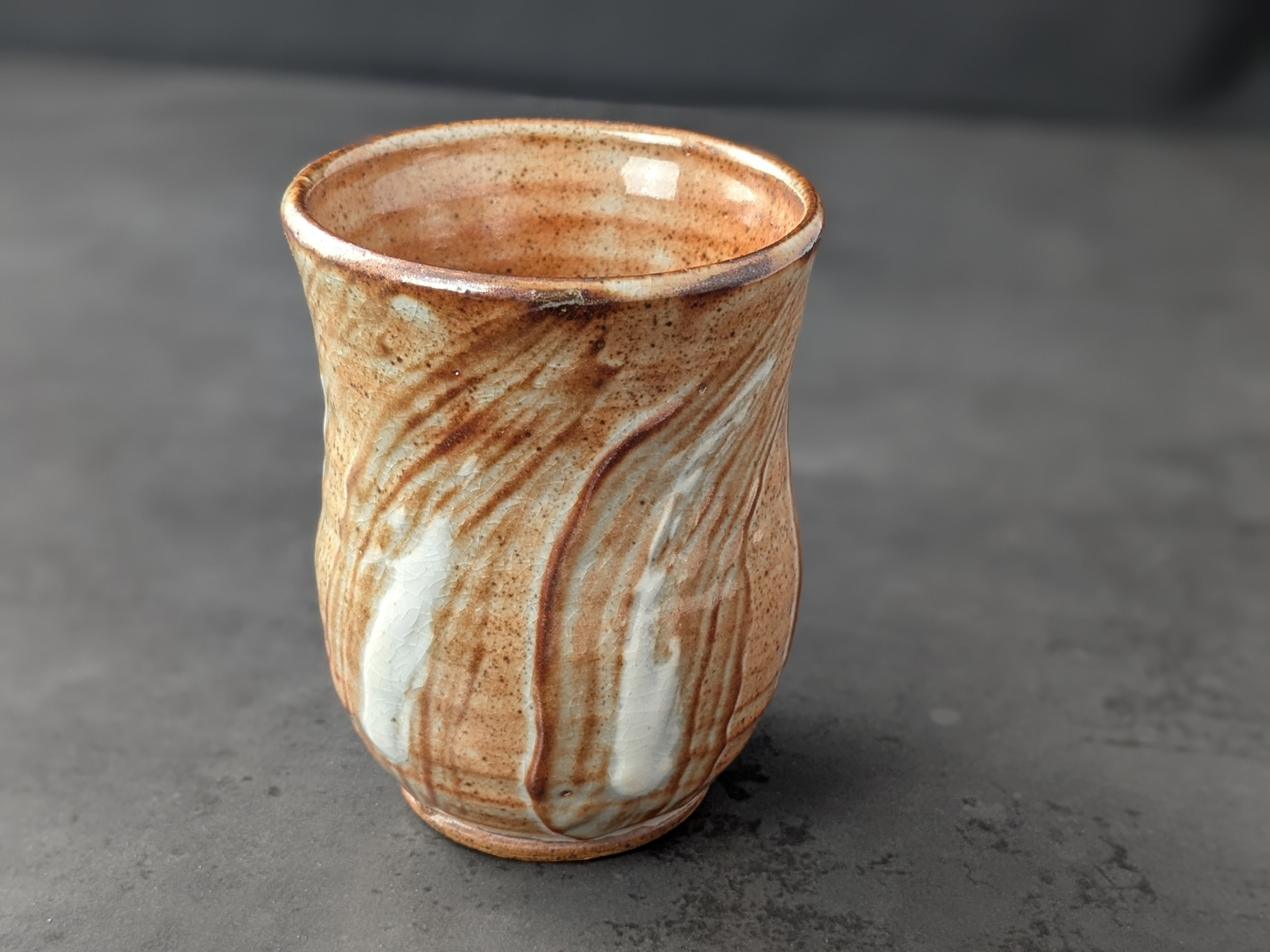 Shino-glaserad Yunomi-teskål. Vedeldad stengods med vildlera och borstade porslinsslipar.